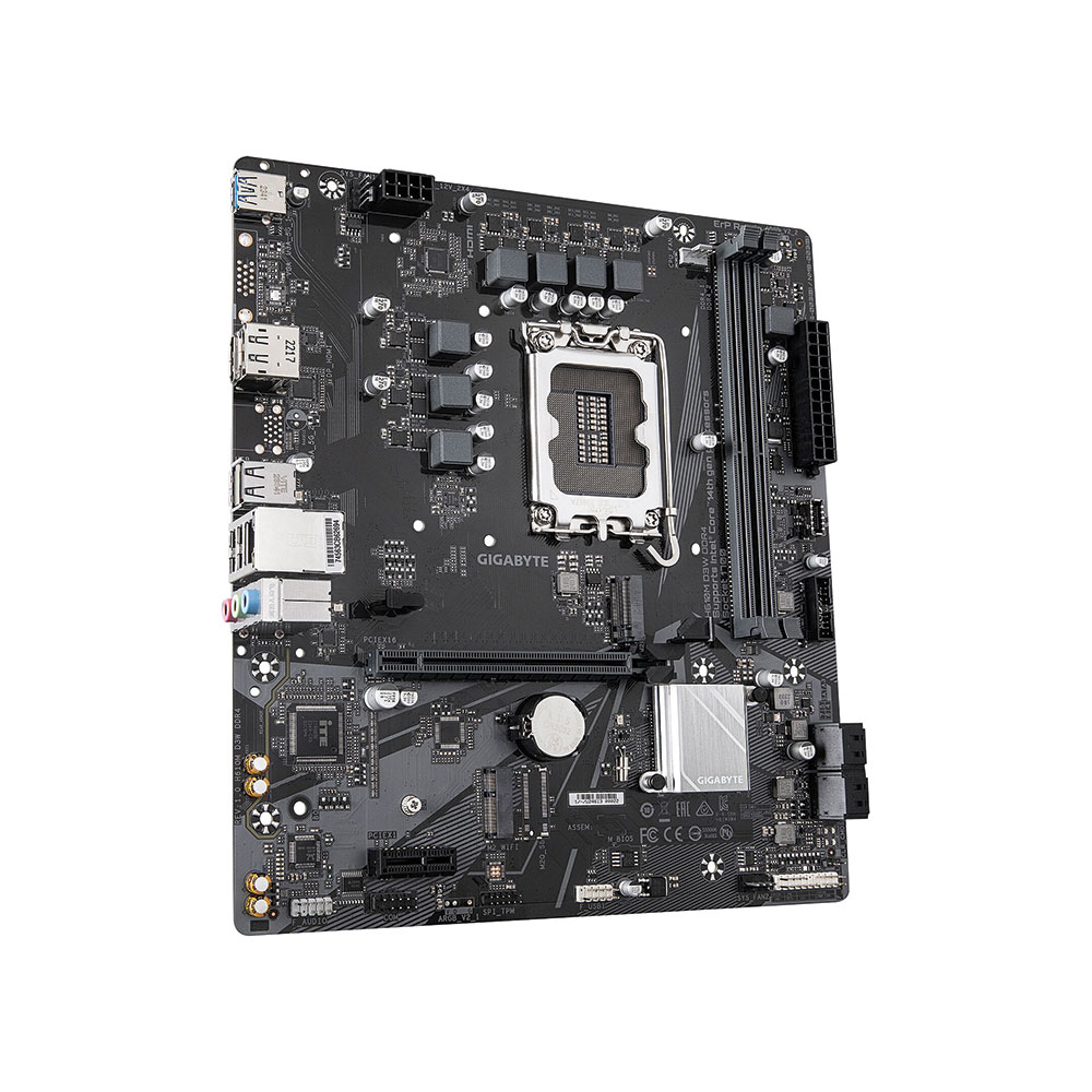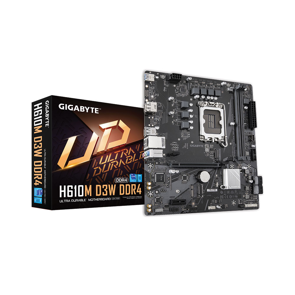 The GIGABYTE H610M D3W WIFI6 is a Micro-ATX motherboard for Intel? LGA 1700 processors (12th, 13th, and 14th Gen). It supports DDR5 memory up to 128GB across 2 DIMM slots and features a 5+1+1 hybrid digital VRM design for stable power delivery. High-speed connectivity includes Wi-Fi 6 (802.11ax) and GbE LAN, along with an NVMe PCIe 3.0 x4 M.2 slot for fast storage. Smart Fan 6 technology monitors multiple temperature sensors and controls hybrid fan headers with FAN STOP functionality for optimized cooling.